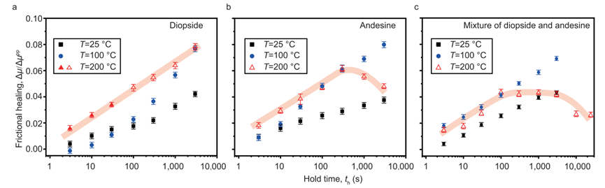 地震发生后断层强度随时间逐渐恢复的过程称为断层愈合,该过程为地震预测、地震复发周期研究提供重要参考。在地震研究中,断层愈合具有多样性,既包括力学上的摩擦愈合,也包括裂隙闭合、水岩相互作用等其他物理-化学范畴的愈合。过去大量的实验数据显示断层的摩擦愈合受矿物组成、温压条件、加载速率等多种因素影响,断层强度恢复通常被认为随着保持时间呈对数线性增加。然而,近年来,科学家们发现了花岗岩、辉长岩等在水热条件下可呈现“反常”愈合现象。
