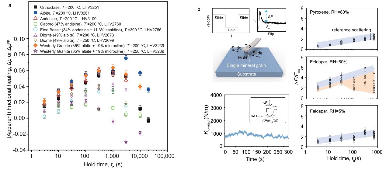 针对这一问题,该研究团队创新性地设计了多类型实验,如调整保持时间增降序列的愈合实验、分离辉长岩主要矿物组分(长石与辉石)的单矿物愈合实验、以及多温度阶段的愈合实验等,发现长石是导致辉长岩摩擦愈合率降低的主要原因(图1)。进一步将实验拓展至多种长石类型及富含长石的岩石,结果表明该效应具有一定的普遍性(图2a)。研究团队结合原子力显微镜下长石单颗粒摩擦愈合实验中观察到的类似现象(图2b),提出长石导致的愈合率降低主要源于接触强度在超过某一特征时间尺度后会显著下降。