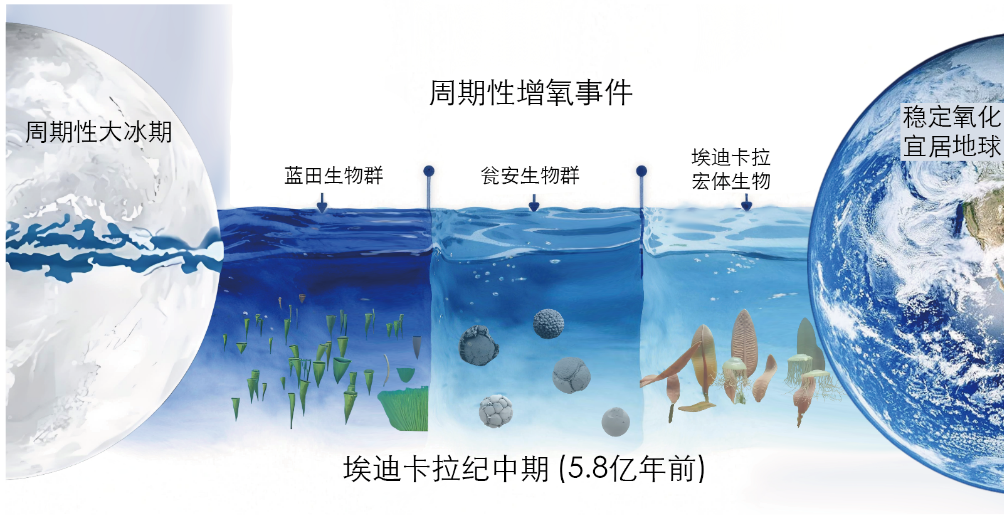图 元古宙末期“雪球地球”事件后,海洋经历了周期性增氧,驱动地球系统从以前稳定缺氧的状态,转变为富氧与缺氧交替出现的不稳定状态,并最终演进为宜居地球,为动物的诞生与演化奠定了基础