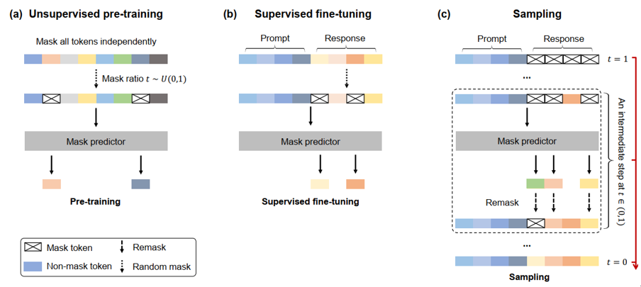 图 LLaDA的训练和推理原理示意图。