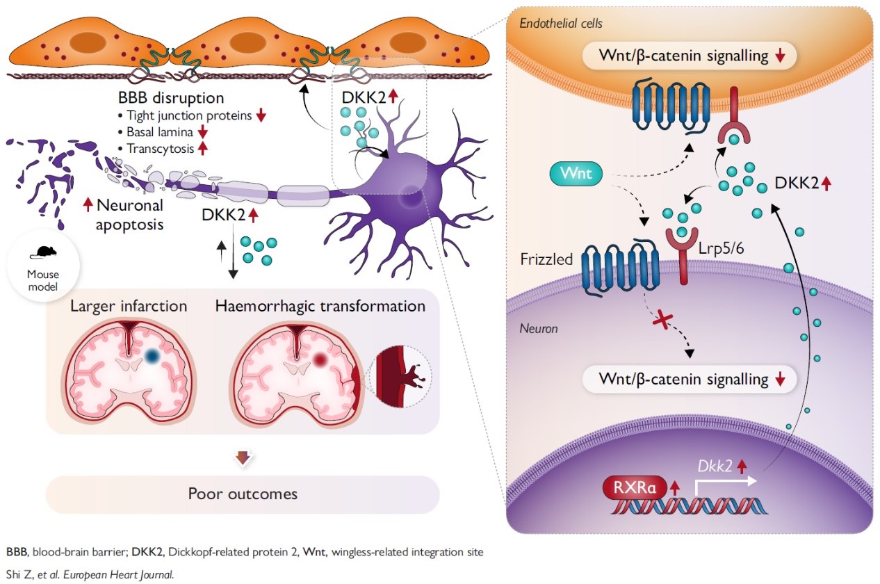 在国家自然科学基金项目(批准号:82273923、32170985、81771293)等资助下,中国科学院深圳先进技术研究院马寅仲副研究员, 吉林大学第一医院畅君雷 教授, 南方医科大学南方医院黄凯滨副主任医师, 南方医科大学附属东莞医院石铸主任医师等开展合作,在缺血性脑卒中预后机制研究领域取得进展。研究成果以“Dickkopf相关蛋白2抑制神经血管Wnt信号导致卒中预后不良加重(Dickkopf-related protein 2 impairs neurovascular Wnt signalling and worsens stroke outcome)”为题,于2025年12月26日在线发表于《欧洲心脏杂志》(European Heart Journal)杂志。论文链接:https://doi.org/10.1093/eurheartj/ehaf959。