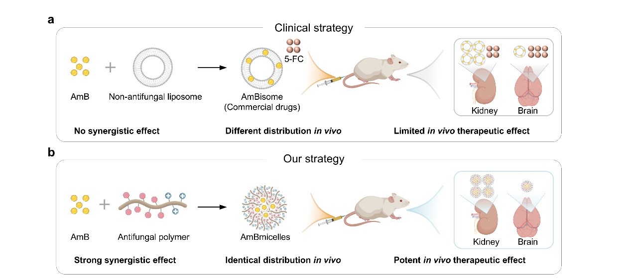 近年来真菌耐药性不断出现,单一抗真菌药物治疗方案疗效往往不佳甚至失败,尤其在严重耐药和难治疗的感染性疾病治疗中可协同增效的两种药物组合通常比单一药物疗效更好。尽管如此,系统性真菌感染尤其是真菌脑膜炎,在临床上依然死亡率高。关键原因之一在于抗真菌药物种类很少,能够实现协同效果的药物组合更是极为有限。即便是体外形成协同效果的药物组合,由于两种药物不同的体内分布和药代动力学导致其很难在体内感染部位实现协同增效。因此,亟需可以实现抗真菌药物分子体内协同的有效策略。