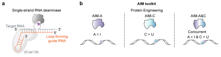 在国家自然科学基金项目(批准号:22425071、22337001)等资助下,北京大学伊成器团队于2026年1月2日在《自然·生物技术》(Nature Biotechnology)期刊上发表了题为“Single-strand deaminase-assisted editing for functional RNA manipulation”的研究论文,论文链接为https://www.nature.com/articles/s41587-025-02956-7。该研究建立了一种由单链脱氨酶辅助的可调节RNA信息操纵平台AIM(adjustable RNA information manipulation),突破了现有RNA碱基编辑工具“单点编辑”的限制,实现了在靶向区域内对不同数量、多种类型碱基的可控与精准操纵。
