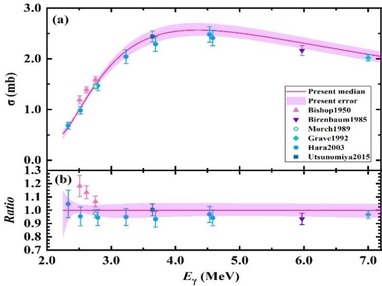 上海激光-电子伽马源(SLEGS)装置是全球首个实现斜散射模式的激光康普顿散射装置,可在0.4~21.7 MeV的能量范围内提供高亮度的准单色伽马射线源。研究团队通过在SLEGS装置上测量pn俘获反应的逆反应D(γ, n)p,对光中子截面进行了高精度测量,其精度提高了2倍多(图)。团队通过使用重子有效场理论进行全局马尔可夫链蒙特卡洛数据分析,获得了精确的p(n, γ)D反应截面和精度为0.1%的热核反应率,其精度比20年前的数值高出大约4倍,新的高精度反应率使重子数密度Ωbh2的不确定度降低了10~16%。