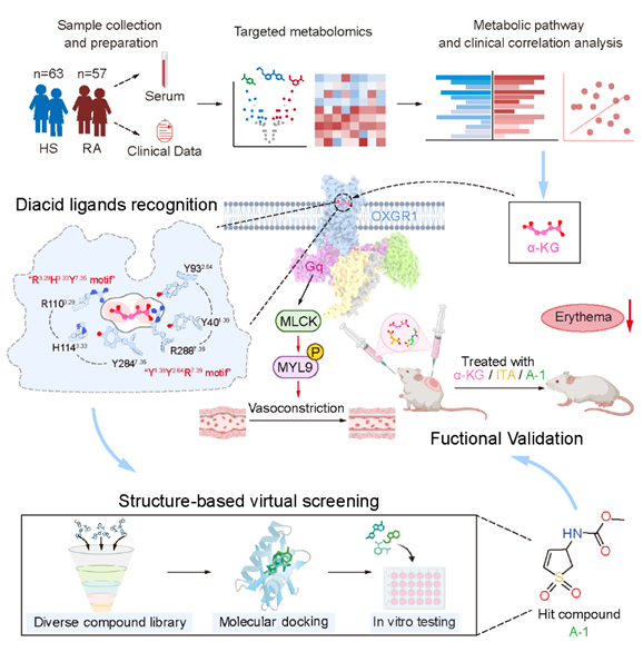 该研究实现了“临床代谢组学—疾病发生机制—受体信号转导机制—人工智能辅助药物设计”的完整研究路径,揭示了靶向代谢通路干预玫瑰痤疮血管功能障碍的分子机制,并基于新靶点OXGR1开发了新型激动剂,为解决玫瑰痤疮持续性红斑这一临床难题提供了全新的精准治疗策略。