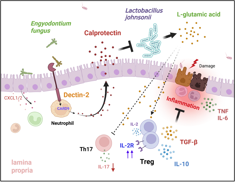 在国家自然科学基金项目(批准号:82370540、82070564、82403250)等资助下 ,中山大学附属第一医院唐策研究员、黄婵燕副主任医师、冯瑞副主任医师、陈旻湖教授等团队在共生真菌通过固有免疫受体调控肠道炎症机制方面取得进展。相关研究成果以“结肠侧齿霉菌通过激发中性粒细胞抗菌活性抑制约氏乳杆菌及其代谢产物谷氨酸以抑制调节性T细胞(Colonic Engyodontium fungus triggers neutrophil antimicrobial activity to suppress Lactobacillus johnsonii-derived glutamic acid-maintained Tregs)”为题,于2026年3月2日在线发表于《临床研究杂志》(Journal of Clinical Investigation)上 。论文链接:https://doi.org/10.1172/JCI196788。