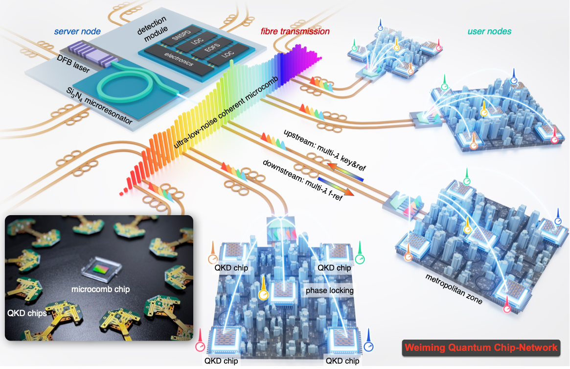 在国家自然科学基金项目(批准号:12325410、62505005、62235001、123B2065、124B2081、62405271、U23B2047、62321166651、U25D8009、12293052、12504575、12134001)等资助下,北京大学物理学院现代光学研究所王剑威教授、龚旗煌教授团队与电子学院常林研究员团队成功研制出全功能集成的高性能量子密钥发送芯片与光学微腔光频梳光源芯片,并在此基础上构建了基于集成光量子芯片的大规模量子密钥分发网络——“未名量子芯网”。 此项突破为未来建设覆盖更远距离、容纳更多用户、支撑更大规模的实用化量子保密通信网络提供了坚实的芯片级解决方案。相关成果以“基于集成光量子芯片的大规模量子通信网络(Large-scale quantum communication networks with integrated photonics)”为题,于2026年2月12日发表在《自然》(Nature),论文链接:https://www.nature.com/articles/s41586-026-10152-z。