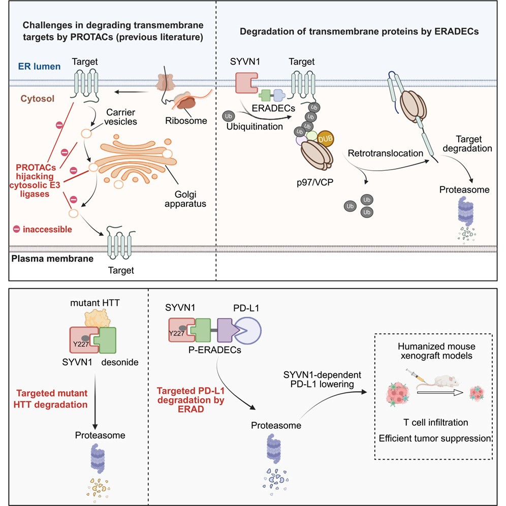 基于上述机制研究,研究团队巧妙利用跨膜蛋白合成时会进入内质网进行折叠而难以接触到细胞质内降解系统这一特性,提出并建立了一种“劫持”ERAD的新技术策略—内质网相关降解招募型嵌合分子ERADEC降解体系。通过设计具有双重功能的小分子,一端识别目标蛋白,另一端连接内质网上的降解标签蛋白SYVN1,将目标蛋白主动“引入”ERAD通路,使其被选择性降解。与以往主要依赖细胞质降解系统的策略不同,这一方法利用内质网自身的降解机制用于跨膜蛋白靶向降解。