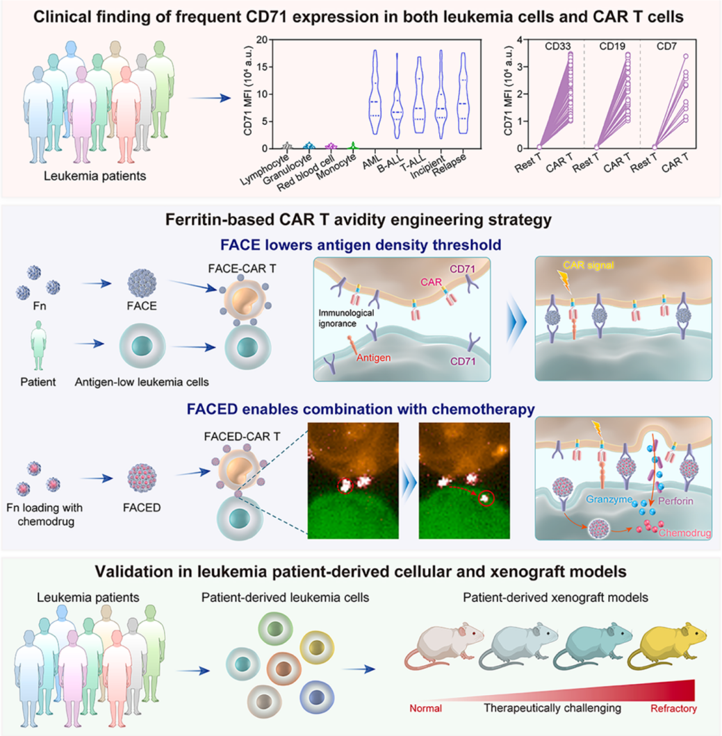 在国家自然科学基金项目(批准号:T2225021)等资助下,中国科学院过程工程研究所魏炜研究员、马光辉研究员与南方医科大学珠江医院李玉华教授、中国医学科学院血液病医院王建祥研究员开展交叉合作,在提升CAR T细胞治疗难治复发白血病疗效方面取得进展。研究成果以“铁蛋白团簇细胞连接子用于CAR T细胞亲和力调控治疗难治白血病(Ferritin aggregation cell engager for CAR T avidity engineering against refractory leukemias)”为题,于2026年3月10日发表于《细胞》(Cell)。论文链接:https://doi.org/10.1016/j.cell.2026.02.005。