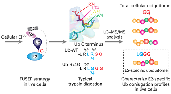 在国家自然科学基金项目(22137004、22307062)资助下,清华大学药学院尹航教授团队在蛋白质泛素化研究领域取得新进展,开发了FUSEP(Fusion E2-Ub-R74G Profiling)化学生物学技术,揭示了酪氨酸泛素化的存在,相关成果以“E2–Ub-R74G策略揭示活细胞中E2泛素结合酶特异性泛素结合特征(E2–Ub-R74G strategy reveals E2-specific ubiquitin conjugation profiles in live cells)”为题,于2025年1月6日在《自然·化学生物学》(Nature Chemical Biology)上发表,论文链接:https://www.nature.com/articles/s41589-024-01809-9。