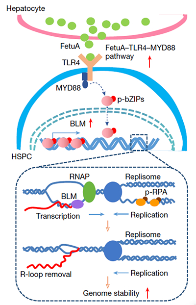 进一步研究发现,肝细胞分泌的胎球蛋白A(fetuin-A)结合到HSPC表面的Toll样受体(Toll-like receptor 4,TLR4)受体,激活TLR4-MYD88-bZIP通路,上调核酸解旋酶BLM的表达,从而解除HSPCs因DNA复制转录中产生的R-loops结构,维持HSPCs的基因组稳定性。若小鼠敲除Fetua基因后,相关基因复制转录产生的R-loops水平显著增高,小鼠对白血病明显易感。在人类胎肝中同样验证了上述保护机制,低浓度fetuin-A与儿童白血病的发生密切相关。