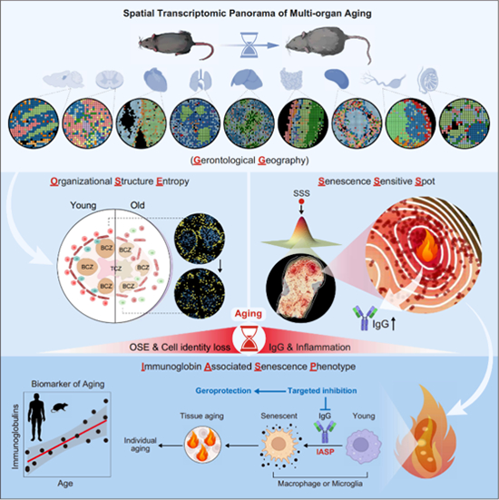 在国家自然科学基金项目(批准号:82125011、82488301、81921006)等资助下,中国科学院动物研究所刘光慧研究员与华大生命科学研究院顾颖研究员、中国科学院北京基因组研究所张维绮研究员及中国科学院动物研究所曲静研究员合作,在免疫球蛋白驱动衰老研究方面取得进展。研究成果以“空间转录组景观揭示免疫球蛋白相关细胞衰老是衰老的关键特征(Spatial Transcriptomic Landscape Unveils Immunoglobin- associated Senescence as a Hallmark of Aging)”为题,于2024年11月4日在《细胞》(Cell)杂志在线发表。论文链接:https://doi.org/10.1016/j.cell.2024.10.019。