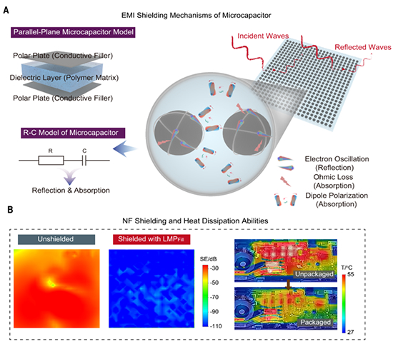 图 (A)微电容结构的绝缘电磁屏蔽机理模型;(B)绝缘电磁屏蔽聚合物复合材料的近场屏蔽和散热性能