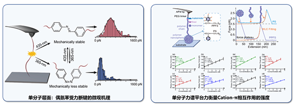 以上工作展现出单分子力谱技术在研究力化学、高分子结构力学以及微观相互作用等交叉领域的巨大潜力与重要价值。同时揭示了力敏团等微观基元对材料整体力学性质方面的影响,为深入理解材料宏观力学属性提供理论指导。