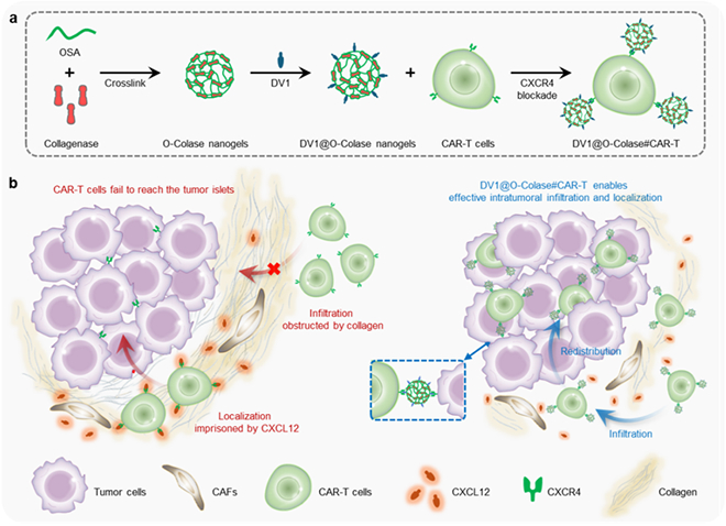 图 “胶原酶纳米凝胶背包式”CAR-T细胞的制备及抗肿瘤机制示意