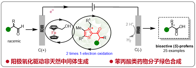 近年来,一方面化学和生物融合的策略促进了人工酶和光酶催化等领域的发展,不断扩展着生物合成的边界。另一方面,电化学合成作为化学合成领域快速发展的创新工具,具有绿色可持续和电势可控等优势。当前电化学合成与酶催化的结合主要包括电化学再生酶的辅因子和电化学-酶催化级联。这两种方式都是实现酶的天然反应性,如何利用电化学解锁酶的非天然催化模式,仍待突破。黄小强小组巧妙地融合了二茂铁甲醇介导的阳极氧化和ThDP依赖酶催化,将连续2次单电子氧化机制引入酶中,并结合定向进化技术理性改造酶的活性位点,成功开发了一例电-酶催化的非天然生物合成转化。该体系能以清洁电能替代传统化学氧化剂,在较低酶负载量下,实现布洛芬、萘普生等十种(S)-丙酸类抗炎药物的高效合成,对映选择性最高可达99% ee,并兼容全细胞催化与放大量制备。研究团队进一步通过酶促动力学测定、电子顺磁共振及计算模拟等实验手段,探索了可能的电-酶协同机制以及立体选择性的来源,为后续开发电-酶非天然转化提供了思路。