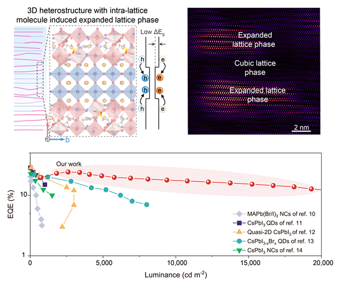 在国家自然科学基金项目(批准号:22325505)等资助下,中国科学技术大学姚宏斌、樊逢佳、林岳、胡伟联合上海光源郑官豪杰在纯红钙钛矿发光二极管领域取得进展。相关成果以“三维钙钛矿异质结实现高性能钙钛矿纯红发光二极管(Intragrain 3D perovskite heterostructure for high-performance pure-red perovskite LEDs)”为题,于2025年5月7日在线发表于《自然》(Nature)杂志上,论文链接:https://www.nature.com/articles/s41586-025-08867-6。
