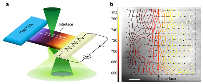 图 声子输运可视化的电镜显微技术。(a)实验设计示意图。(b)AlN/SiC界面附近的等温线分布图(彩色线条)和温度梯度方向(黑色箭头)。比例尺:200 nm