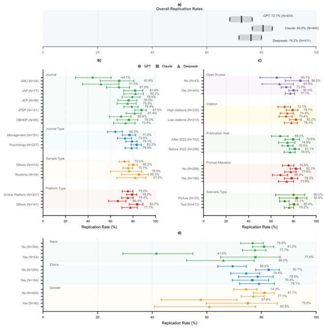 研究团队创新性地提出“硅基复制”研究方法,即用AI模拟人类参与者进行心理学实验,从五个顶级学术期刊中随机选择了156个心理学和管理学实验,使用GPT-4、Claude 3.5 Sonnet和DeepSeek V3三个最先进的大语言模型进行实验复制,构建了迄今最大规模的AI复制心理学实验数据库。结果显示,AI模型在主效应复制成功率高(73%~81%),效应方向一致性约80%,说明大语言模型能够较好地模拟人类心理反应。