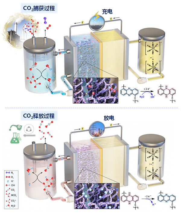 直接空气碳捕集技术正成为应对气候变化的关键负排放解决方案。电化学氧化还原介导的碳捕集技术反应条件温和、调变性强,捕集的高纯CO2可进一步转化为下游化学品,有望推进碳循环经济构建。现有系统往往将活性分子溶解于电解液,通过酸碱性调节,实现CO2捕获与释放。然而,还原态活性分子极易被空气氧化,导致系统失衡。