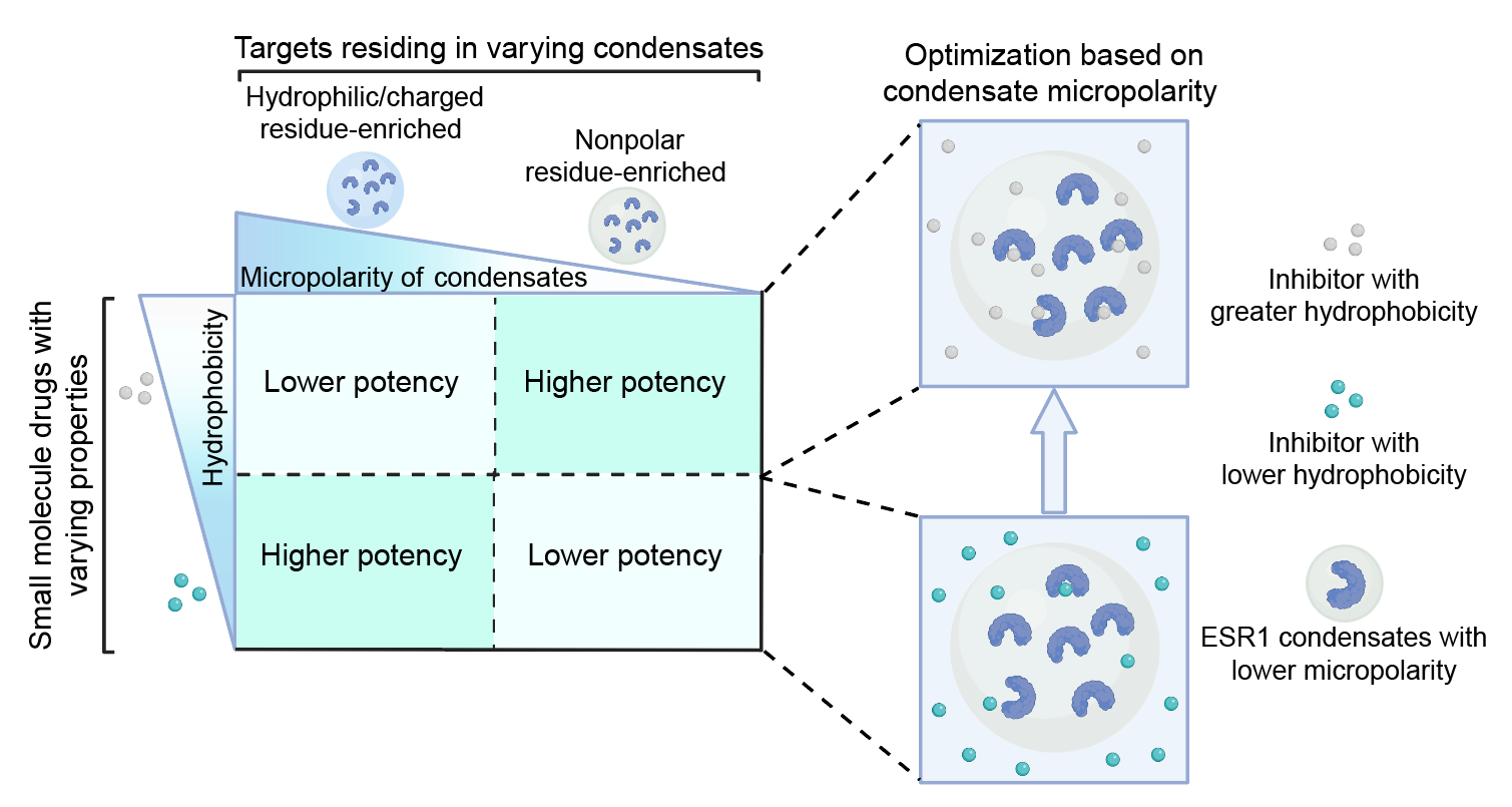 相分离驱动形成的凝聚体内部存在独特的物理化学微环境,很多重要的药物靶点,如ESR1和EGFR等,发生功能时都可能定位于凝聚体内部。以往的药物研发主要考虑小分子与靶点之间的亲和力大小,不考虑凝聚体微环境对于小分子靶向效率的影响。针对上述问题,研究团队通过生物信息学和荧光寿命成像等方法,发现靶向相分离蛋白的小分子药物和相分离蛋白相关的小分子代谢物具有更高的疏水性;在体外重建乳腺癌治疗靶点ESR1的凝聚体,发现疏水性更高的ESR1抑制剂在ESR1凝聚体内部更加富集。本研究打破了传统药物设计只关注蛋白质“口袋结构”和亲和力的单一思维,开辟了“凝聚体微环境驱动”的多维药物设计新视角,有望成为提高药物有效性与选择性的关键策略。
