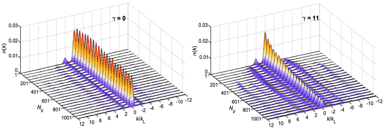 图 无相互作用(左)与强相互作用系统(右)在踢时的动量分布随踢击次数演化过程