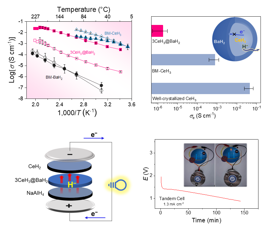 氢负离子(H⁻)是氢原子获得一个电子后形成的阴离子,具有质量轻、氧化还原电位低(H2/H⁻,–2.3 V 相对于标准氢电极)等特性,被认为是电化学器件中的一类新型载流子,在推动二次电池、燃料电池、电解池等技术革新方面展现出重要应用潜力。然而,由于缺乏能同时具备高离子电导率、低电子电导率、高热稳定性和电化学稳定性且与电极兼容的电解质材料,氢负离子二次电池技术迄今为止未能实现突破。因此,开发综合性能优异的氢负离子导体被视为固态离子学和氢能领域的前沿课题。