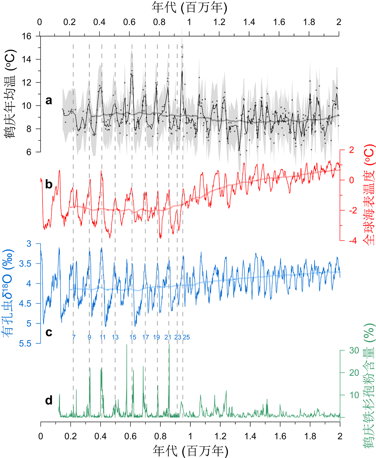 图 过去200万年海陆温度记录对比。(a)生物标志物GDGTs重建的鹤庆盆地年均温变化;(b)全球海表温度集成(Clark et al., 2024);(c)深海氧同位素集成(Lisiecki & Raymo, 2005);(d)鹤庆钻孔铁杉孢粉含量(An et al., 2011)