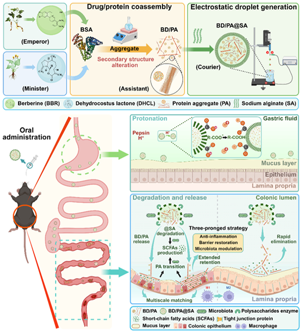 研究团队从中医典籍《黄帝内经》提出的“君-臣-佐-使”药物配伍理论中获取灵感,该理论要求在处方中需赋予不同组分不同角色定位,以便治疗时各司其职。该药物配伍理论重视组分协同配伍、谋求药物增效减毒、强调引药直达病所等理念与现代药物递送技术的目标高度契合。研究团队通过融合该中医观念与现代药物递送技术,成功设计了一种高效靶向缓解溃疡性结肠炎的香连丸组分口服制剂:香连丸中两种主要有效成分小檗碱和去氢木香内酯作为“君”“臣”组分,通过药物-蛋白共组装技术,使两种活性成分被纳米/微米尺度的牛血清白蛋白聚集体负载作为“佐”组分,通过静电液滴技术将诸成分封装于海藻酸钠微球作为“使”组分。研究团队通过器官成像、组织化学染色、酶联免疫吸附、微生物多样性分析等技术,发现该制剂各组分的协同作用显著延长了两种活性成分的生物利用度,使其在约1/20的原始剂量下起效长达一周;且相比于临床一线药物5-氨基水杨酸,对溃疡性结肠炎的三大病理特征炎症、上皮屏障缺陷和微生态失调的改善效果更显著。同时,利用微生物组、代谢组学和转录组学分析还发现制剂中的蛋白聚集体和海藻酸钠微球具有药物可转化的特性,能被乳酸杆菌群转化为短链脂肪酸,协同缓解溃疡性结肠炎最大限度地提高其疗效(图)。