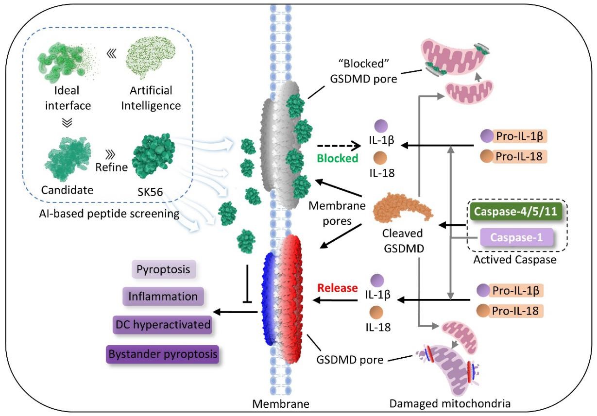 该研究通过人工智能筛选的肽类分子SK56,可直接与GSDMD-NT孔道相结合抑制焦亡反应,并通过细胞ESCRT膜修复系统减缓细胞死亡,为焦亡引发的炎症疾病治疗提供了新思路。