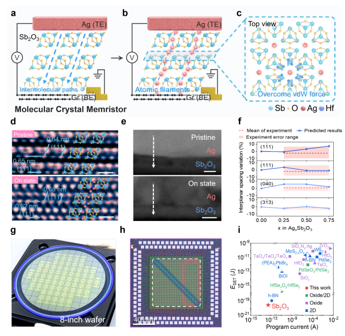 针对这一难题,上述研究团队引入一种无机分子晶体,通过构建范德华离子迁移通道实现忆阻器各项性能的大幅提升。这种无机分子晶体由Sb4O6分子笼单元组成,分子笼通过范德华力相互连接,形成高度有序且均一的分子间隙。这些间隙为Ag+离子提供了天然的迁移通道,使离子传导主要受弱范德华作用调控,从而显著降低了迁移能垒(0.41 eV),避免了晶格损伤并提升了器件稳定性。该忆阻器实现了接近理论极限的超低开关能耗(26 zJ)和超过109次的循环耐久性。此外,器件尺寸可从微米尺度微缩至纳米量级。研究团队进一步在8英寸晶圆上构筑了大规模交叉阵列,同时将其集成至单片CMOS芯片,用于实现储备池计算。在动态视觉识别任务中达到100%准确率,展示了分子晶体忆阻器在类脑计算中的应用前景。