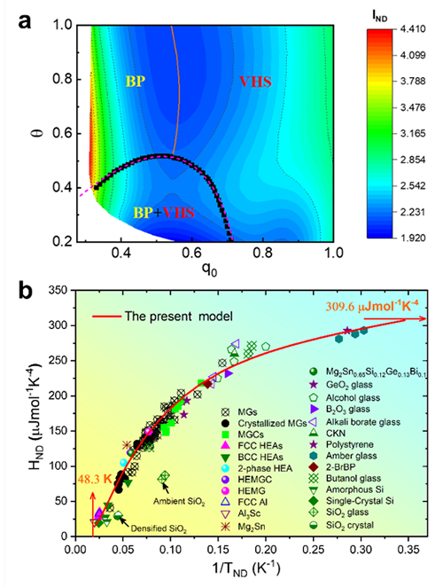图 固体声子统一理论:(a)“玻色峰和范霍夫奇点”非德拜反常全景相图;(b)143种真实固体低温比热数据验证