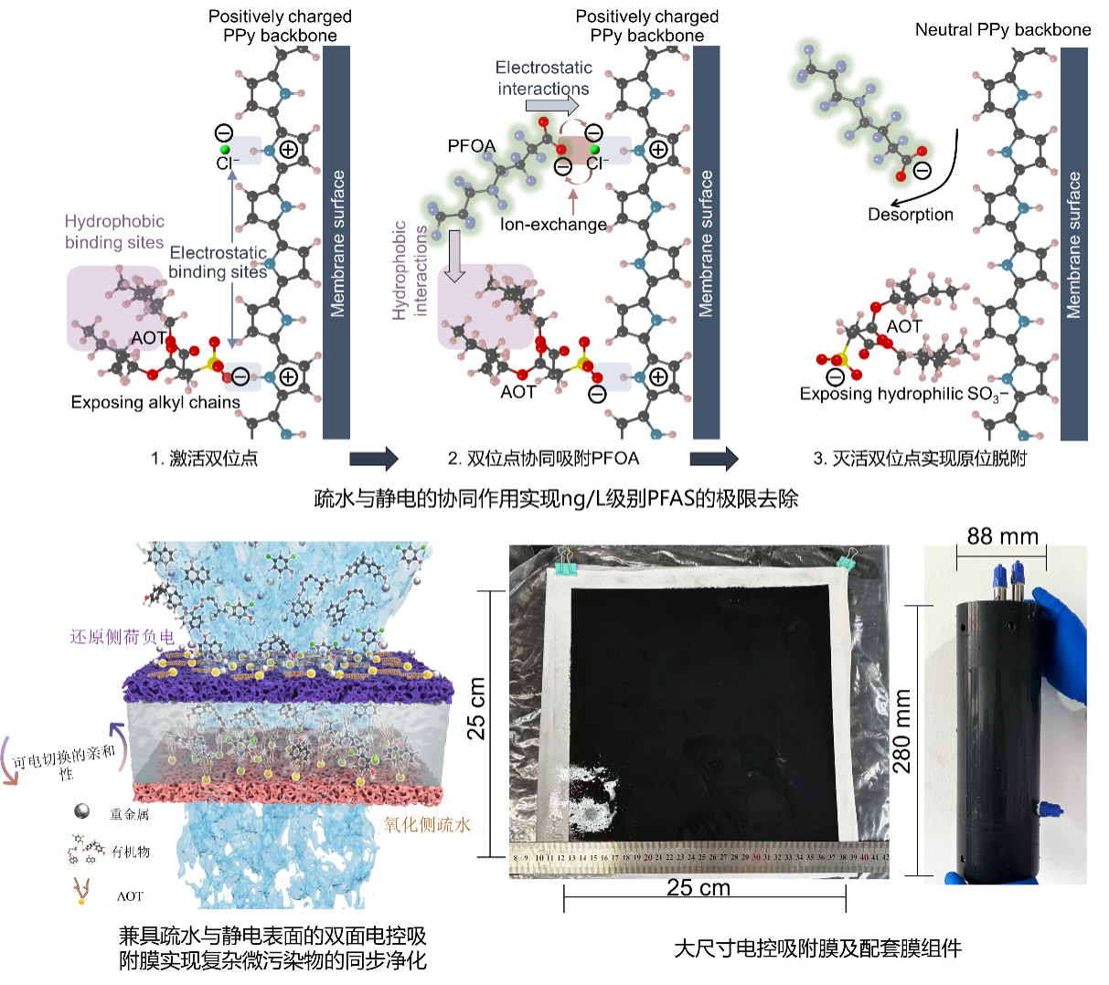 针对上述难题,团队研发出系列具备可控表面疏水、荷电结合位点的低压高水通量电控吸附膜;通过电信号调控膜表面功能分子的空间取向,选择性暴露其疏水、荷电基团,利用疏水、静电相互作用以及过滤过程中的强制对流作用实现复杂实际水质中低浓度微污染物的高效去除,施加短暂的反向电场可改变功能基团的暴露状态实现膜的有效再生。例如,通过在膜表面同时构筑疏水与静电双结合位点,首次实现单次过滤过程中PFAS降至4 ng/L以下,同时保持高通量(288 L/m2/h/bar),满足美国环保署规定对全氟化合物的最严苛的安全限值要求,能耗较商用纳滤/反渗透膜下降75%~80%,成本降低59%。此项研究成果为我国饮用水质深度净化提供了关键科技支撑。