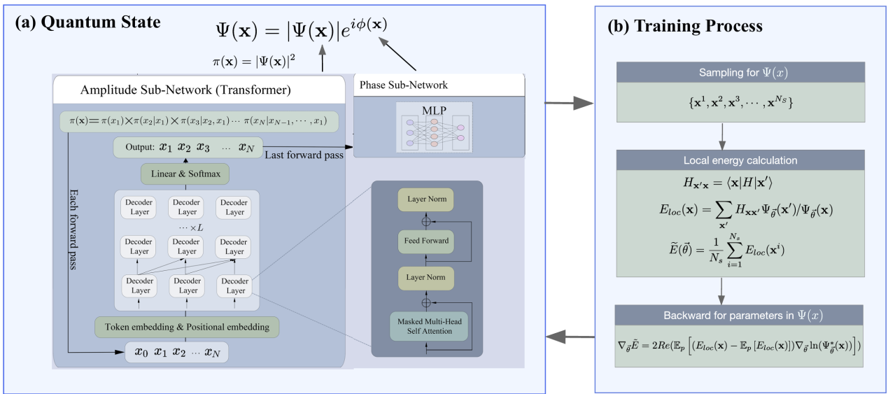 图 乾坤网络的架构图。(a) 用于构建电子波函数拟设的仅解码器Transformer架构,它将电子占据的轨道构型作为输入,输出波函数的振幅和相位。(b) 模型的训练流程,通过变分蒙特卡洛(VMC)方法对网络参数进行优化,以最小化体系的能量