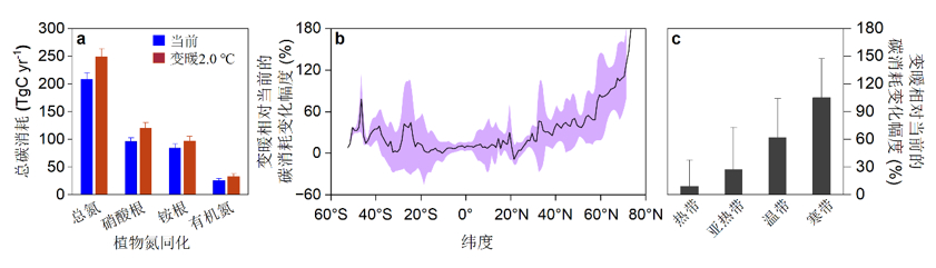 图 全球陆生植物氮同化的碳消耗及其对气候变暖的响应(a为全球陆生植物总氮、硝酸根、铵根和有机氮同化的碳消耗总量;b和c为变暖2.0°C情景下不同纬度植物总氮同化的碳消耗相对于当前的变化幅度)