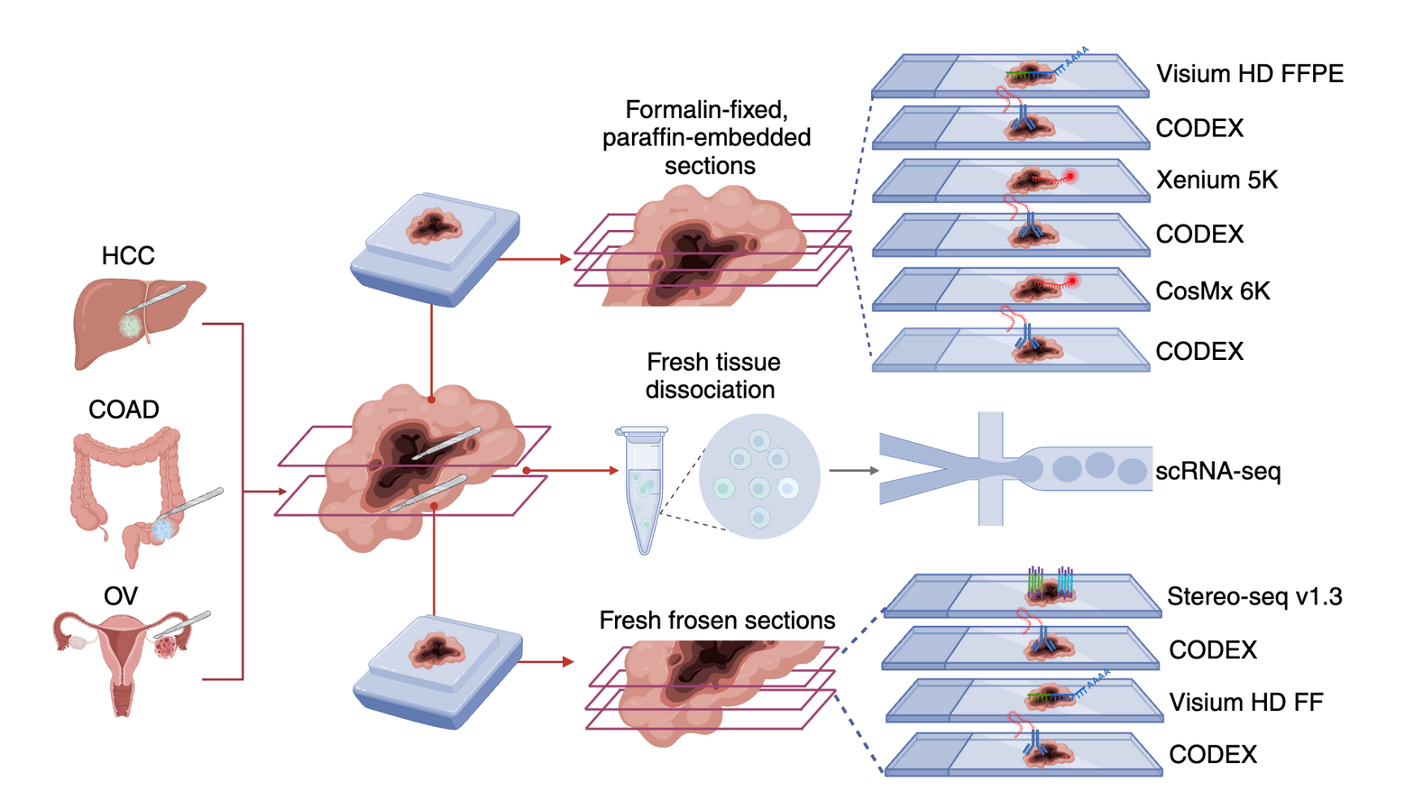 空间转录组学将高通量转录组学与组织结构的空间背景相结合,使单细胞RNA测序在分辨率和通量上有了显著提升。但测序型和成像型空间转录组平台在肿瘤免疫研究上的相对优劣性仍有待系统比较。针对上述问题,研究团队利用临床结肠癌、肝癌和卵巢癌样本的多组连续切片,以空间蛋白组和单细胞转录组为参考数据集,系统性的比较了4种空间转录组平台在捕获灵敏度、特异性、细胞分割、细胞聚类、细胞注释、空间聚类上的异同性,为从空间视角解析肿瘤免疫力及免疫相关机制提供了关键参考,并为推动空间转录组技术发展、计算模型优化及相关生物学问题解析提供了重要支撑。