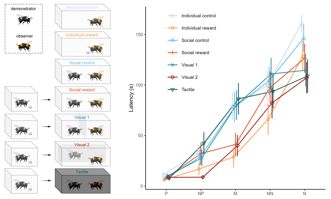 基于此,研究团队将社会互动与判断偏差测试相结合,检验一只熊蜂在被诱导进入积极情绪状态后,是否能够通过短暂的社会接触将这种情绪“传递”给另一只同伴,并进一步探索其近端机制(proximate mechanisms)。系列实验结果显示,与处于积极情绪状态的个体短暂互动后的熊蜂,在面对模糊刺激时呈现出类似的“乐观偏向”,具体表现为反应速度显著加快,并更倾向于将中性刺激判断为奖励刺激。进一步的感官分离实验表明,这种情绪传染并非依赖嗅觉或触觉线索,而是可以仅通过视觉信息实现(图)。