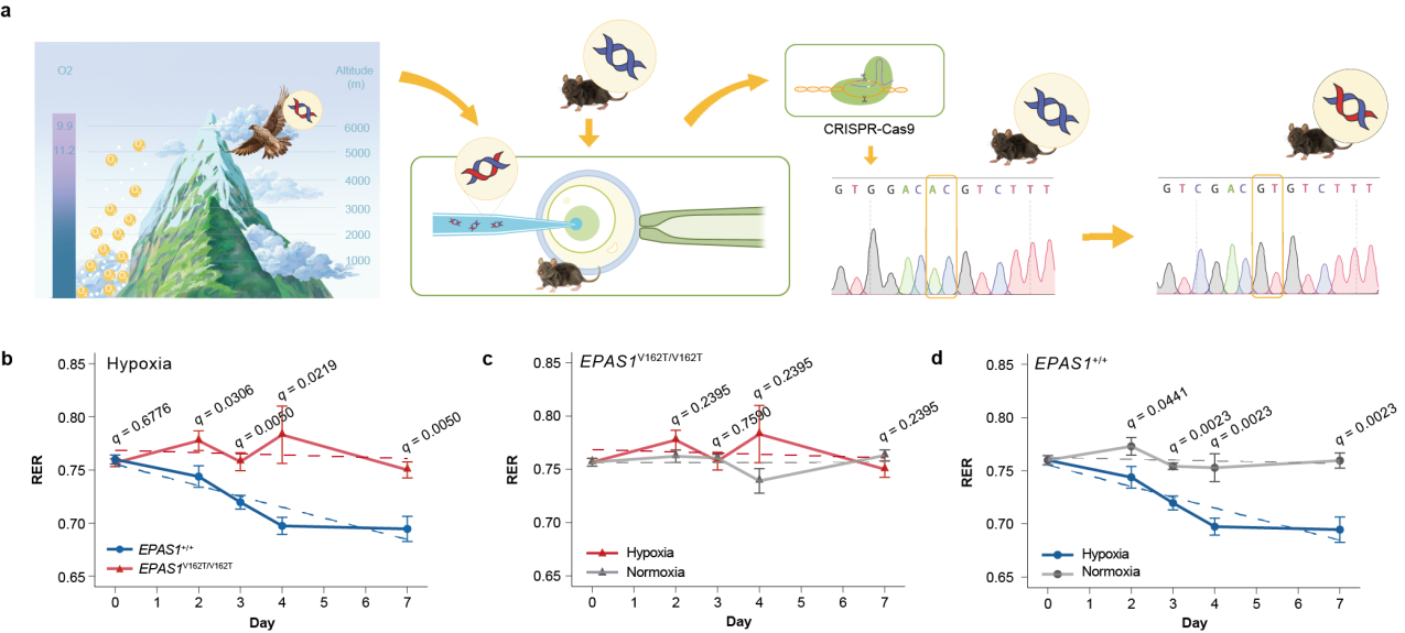 在该研究中,基于在青藏高原猎隼中鉴定的EPAS1基因正选择位点(Pan et al., Mol. Ecol.),团队运用基因编辑技术首次建立了EPAS1隼型小鼠模型,利用呼吸交换率(RER)来探究隼型小鼠在低氧条件下的糖、脂代谢偏向性。结果发现经低氧处理后,隼型小鼠的RER值在0.75附近随机波动,而野生型小鼠的RER值在低氧处理后显著降低(脂代谢偏向):说明隼型小鼠在低氧下具有维持糖脂代谢平衡的能力。进一步分析两种基因型小鼠在低氧下的主要代谢底物(葡萄糖和脂肪酸)含量,发现隼型小鼠的葡萄糖与大部分脂肪酸含量可在肝脏中逐渐恢复至其常氧水平,野生型则无法恢复(与常氧下相比,其肝脏葡萄糖含量显著降低,脂肪酸含量显著升高),说明隼型小鼠具有更好的糖脂代谢调节能力。值得一提的是,隼型小鼠在低氧下相较于野生型具有较高的糖代谢和较低的脂代谢水平,该模式与青藏高原野生猎隼种群中的代谢模式相一致。团队进一步通过功能验证实验发现该突变会导致EPAS1蛋白与ARNT蛋白的亲和力下降,与pVHL蛋白的作用增强,导致低氧下EPAS1的活性降低,从而钝化了隼型小鼠的低氧反应。这其中糖脂代谢的一些关键限速酶在隼型小鼠糖脂代谢稳态调节中起到了关键作用。团队还发现行为调节在隼型小鼠糖脂代谢稳态维持中具有重要作用。从进化角度看,隼型小鼠维持糖脂代谢稳态在机体应对低氧胁迫时具有重要意义:体重在低氧下可较快恢复,减少了体内氧化应激反应,并提高急性低氧下小鼠的存活率。