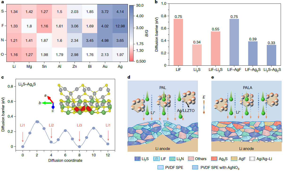 图 含Ag2S/AgF塑性SEI的设计。(a)不同组分体积模量与剪切模量的比值;(b)SEI组分体相及界面处的锂离子扩散势垒;(c)锂离子沿Li2S-Ag2S界面的扩散势垒及示意图;(d)传统富无机SEI脆性大、易破碎;(e)含Ag2S/AgF塑性SEI具有优异的变形能力和结构稳定性