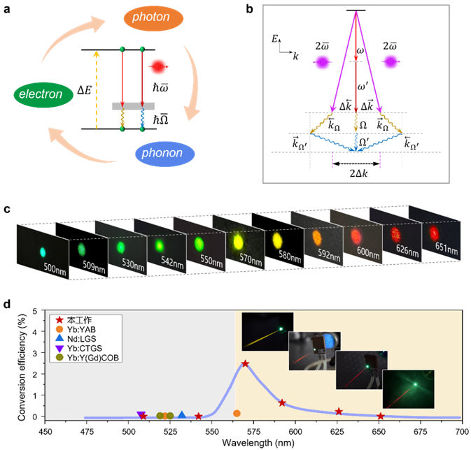 针对上述挑战,山东大学/南京大学联合研究团队提出了将声子耦合效应引入到激光产生与频率转换过程中,利用相干声子外差补偿动量失配,从而为激光材料晶格调控和功能拓展提供了新思路。团队构建了激光过程中电子、声子和光子的多重耦合物理模型,发现了三者共同耦合形成的激发态准粒子并命名为“EPPTON”。团队设计了范围超过150 nm的超宽带倍频输出的激光器件,比传统技术拓宽100倍以上;沿主平面方向实现了2.47%的倍频激光产生效率,比传统晶体提高了3个数量级,证明了声子外差对相位失配的精准补偿作用,从而发展出一种新型的声子外差相位匹配机制。