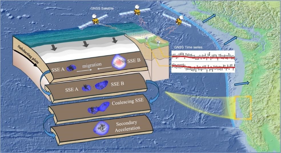 慢滑移是俯冲带深部断层以非常缓慢的速度滑动的一种过程。慢滑移在加速阶段前沿合并,滑动速度增加,常被认为是大地震发生的前兆。但其加速阶段的合并事件,无法确定是慢滑移加速阶段的正常行为还是由前沿合并引起。