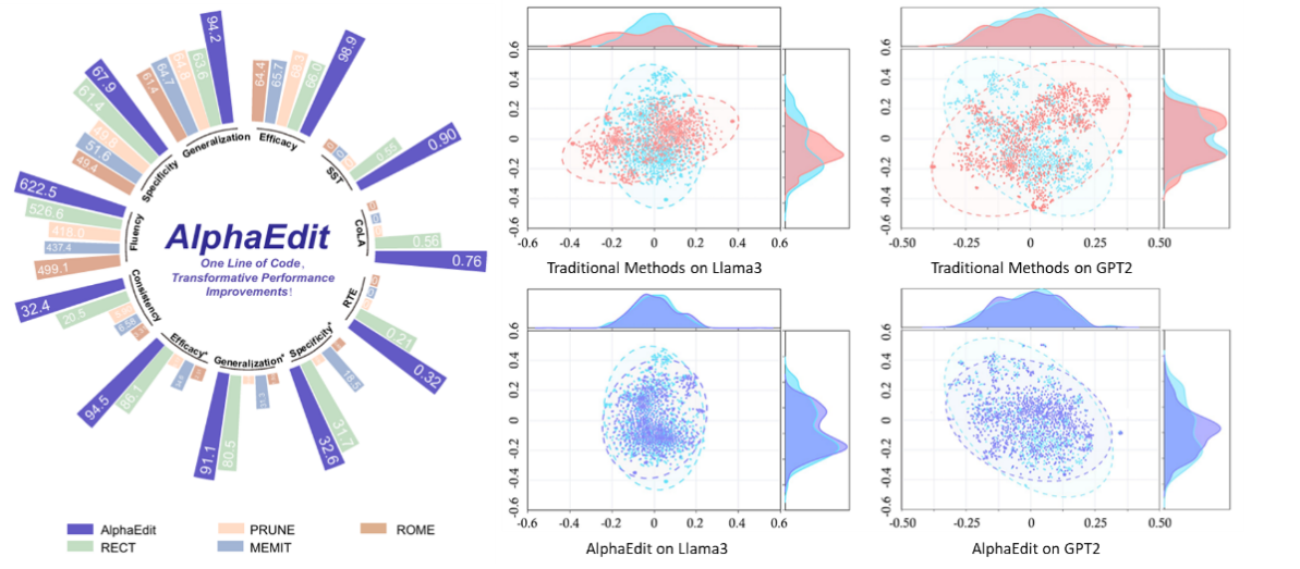 图 左:实验效果对比图。AlphaEdit仅需一行代码即可实现大语言模型的无损知识更新,更新效果超过现有方法。右:模型内部表征分布图。AlphaEdit的更新对模型内部表征的干扰最小,实现了更可控、更安全的知识更新