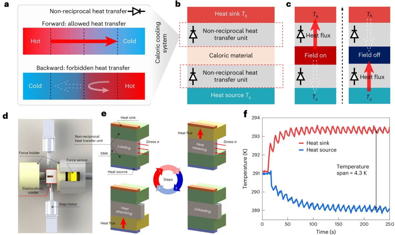 图 (a)非互易传热原理图;(b)使用非互易传热单元的制冷系统结构示意图;(c)非互易传热单元控制制冷系统工作的原理;(d)弹卡单元与驱动系统组装图;(e)Brayton循环下弹卡冷却系统的工作循环步骤;(f)制冷过程中,热沉和热源的温度随时间的变化