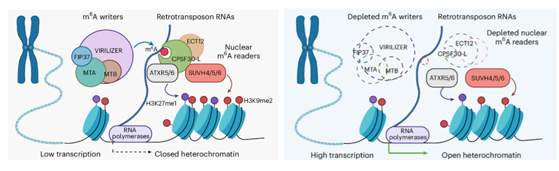 上述研究团队整合遗传学、表观遗传学及转录组测序、ChIP-seq、m⁶A-seq 等多组学技术手段,系统解析了 m⁶A RNA 修饰调控植物逆转座子转录与染色质状态的核心机制。研究发现,多类逆转座子转录本均富含 m⁶A 修饰;当m⁶A 甲基转移酶复合体功能缺失时,这些逆转座子的表达水平会显著上调。机制研究表明,m⁶A 修饰可直接抑制逆转座子的转录活性,从而限制其异常表达。此外,该研究还揭示了 m⁶A 修饰与基因组异染色质形成的功能关联:m⁶A 修饰水平下降会导致逆转座子所在的异染色质区域中 H3K9me2 和 H3K27me1 等抑制性组蛋白修饰丰度降低,进而促进逆转座子激活。该团队进一步证实,m⁶A 结合蛋白 CPSF30-L与ECT12 可特异性识别被 m⁶A 修饰的逆转座子 RNA,并招募相关组蛋白甲基转移酶,实现从 RNA 层面到表观遗传层面的跨层级调控。