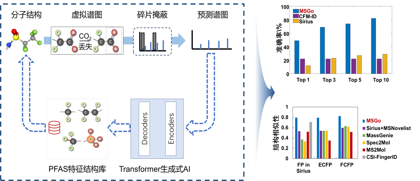 小分子结构解析是暴露组学、环境健康等领域的基础科学问题。然而,质谱数据稀缺、模型适配性不足与结构空间检索复杂,使得未知化学物质的结构解析面临巨大挑战。为此,研究团队以质谱数据匮乏的全氟化合物这一类新污染物为切入点,提出了“虚拟谱图耦合碎片掩蔽”训练策略。该策略通过生成超过十万张全氟化合物虚拟谱图,有效突破了数据稀缺的瓶颈;通过进一步耦合动态碎片掩蔽训练机制,实现了虚拟谱图向实验谱图的高效迁移学习,显著增强了预测的鲁棒性。此外,研究团队优化了质谱与结构的表示方法,提升了Transformer架构与结构解析任务的适配性,并结合了基于束搜索的结构生成策略,最终形成了“数据增强-模型适配-全局检索”的新型分子生成模型MSGo。
