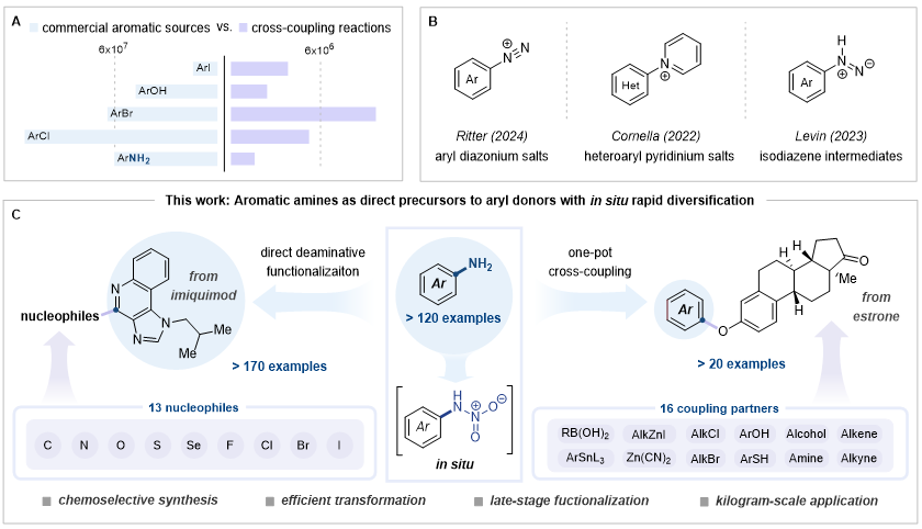 芳香胺是广泛存在于药物、天然产物和农药中的重要分子结构单元,但相关合成砌块应用尚未充分开发。目前工业界仍依赖有140 余年历史的桑德迈尔反应(Sandmeyer Reaction),传统路线需先将芳香胺转化为不稳定、具爆炸风险的重氮盐,还存在铜消耗大、底物兼容性差等问题。