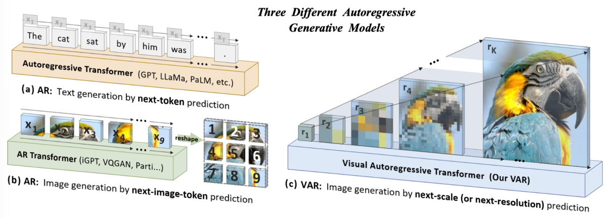 图 传统自回归建模与VAR视觉自回归建模的对比。(a)与(b)展示了传统方法机械地将图像视为一维序列,沿用类似于文本生成的“光栅扫描”顺序逐个预测Token;(c)展示了VAR提出的“Next-Scale预测”范式,模拟人类视觉认知规律,通过由粗到细的层级递进与尺度内并行生成,重构了图像生成的自回归逻辑,实现了效率与质量的双重突破