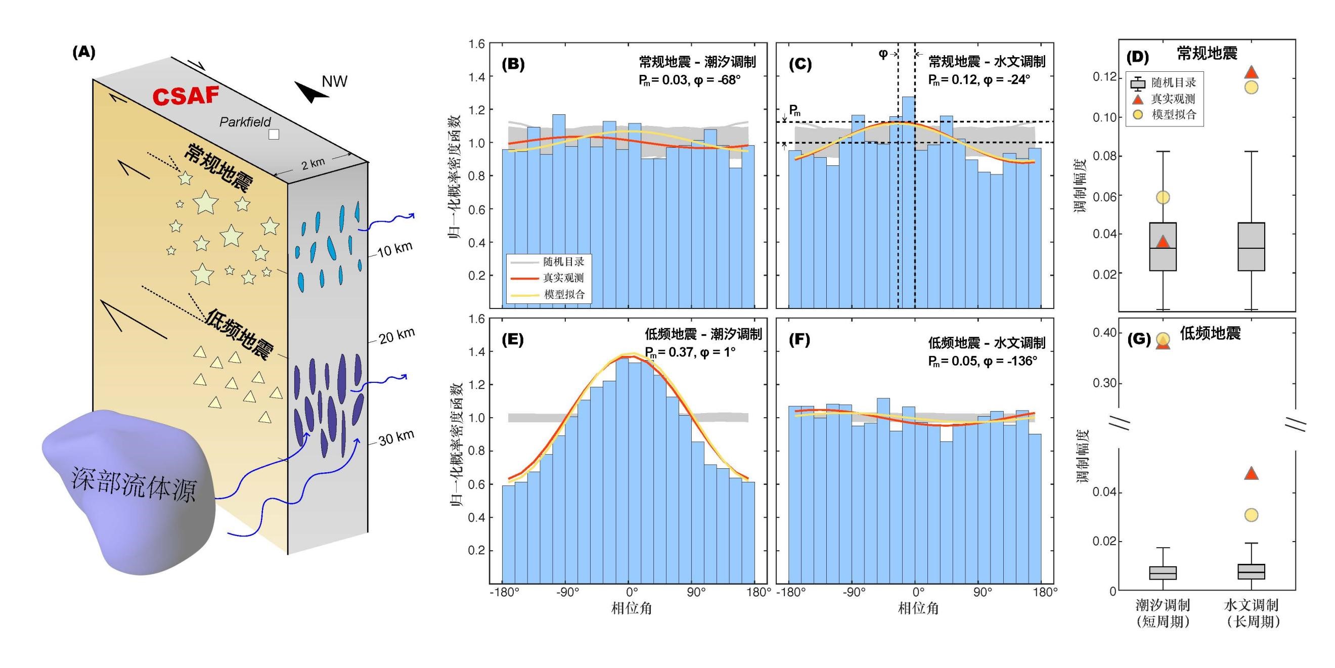 图 常规地震与低频地震截然不同的周期调制现象。(A)本研究的研究区域。(B)常规地震受潮汐加载的调制。(C)常规地震受水文加载的调制。(D)常规地震周期调制的统计显著性。(E)低频地震受潮汐加载的调制。(F)低频地震受水文加载的调制。(G)低频地震周期调制的统计显著性