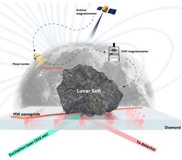 研究团队自2018年起自主研制大视野、高分辨率、高灵敏度量子化学显微镜,基于此对嫦娥五号返回的月壤样品进行了高分辨率磁成像观测。该显微镜基于氮-空位色心量子传感技术,磁场探测精度达到地磁场的千分之一,磁场成像空间分辨率达到2.2 微米,相当于在头发丝横截面上精确绘制出磁地图。研究团队首次在微观尺度上直接可视化了由陨石撞击等在月壤表面生成的纳米级磁性铁的微观磁场分布特征,为“月球磁异常”研究提供了最直接的微观证据。
