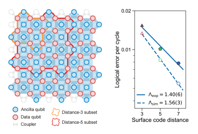 图 左:随着码距增从3(橙色框内比特)增大到5(红色框内比特)再到7(所有彩色标注比特);右:逻辑错误率指数下降
